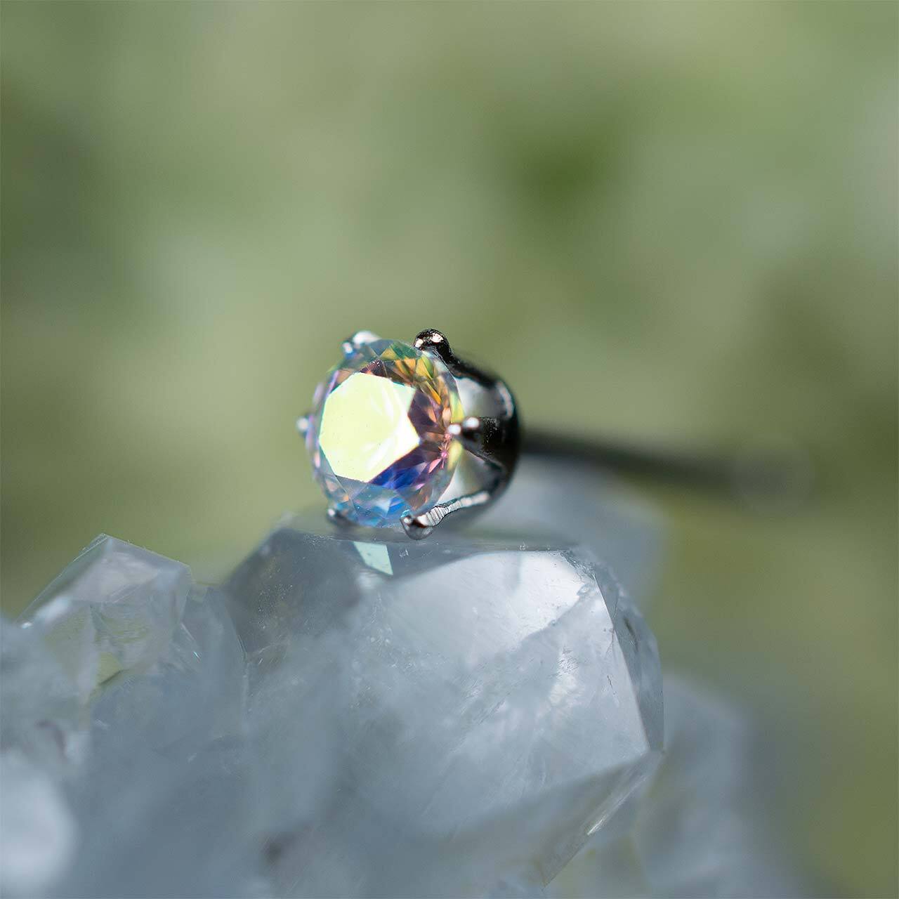 煌めきの強いキュービックジルコニアの表面に金属を蒸着させて虹色の輝きを作り出していて、角度によってパステル調の虹色に見えたり金属のような色に見えたりします。